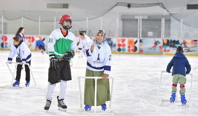 Anneler çocuklarıyla birlikte buz pistinde