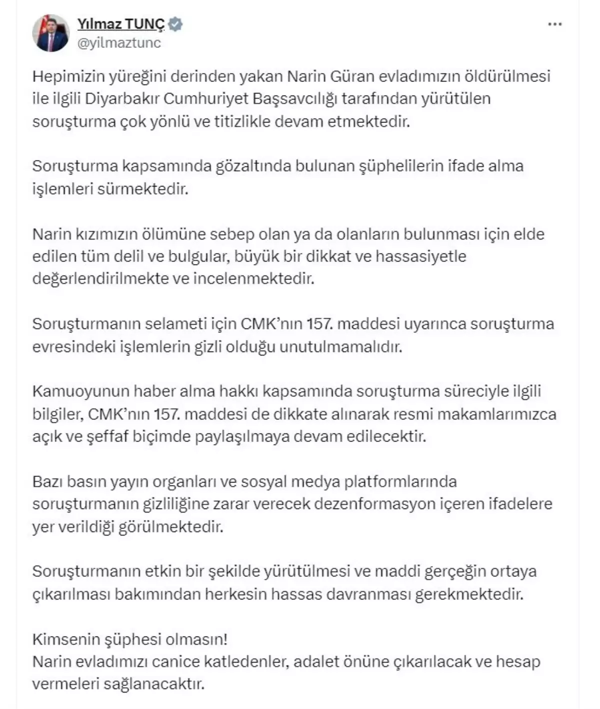 Bakan Tunç’tan Narin Güran Cinayeti Açıklaması
